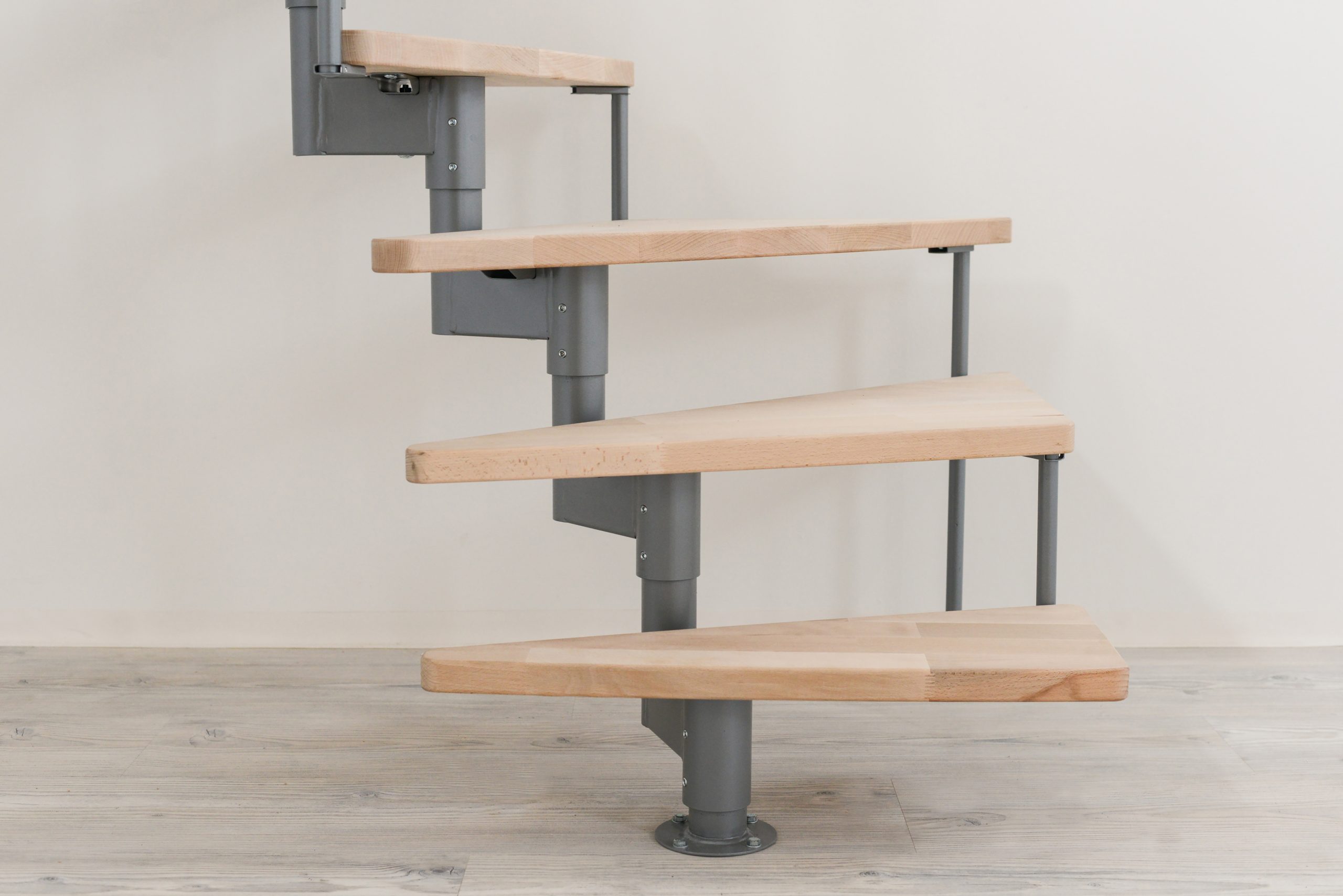 Material | Grå/silver metallkonstruktion med steg av obehandlad massiv bok. |